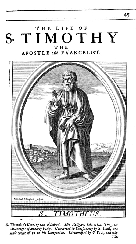 Description: A rendering of Timothy. This engraving is the work of Michael Burghers.