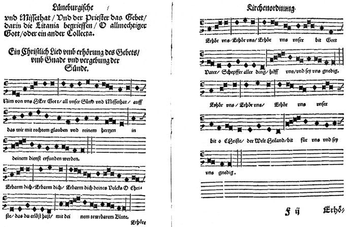 Description: Printed music from the the church order of Braunschweig-Lüneburg, commissioned by Heinrich and Wilhelm of Braunschweig, and based on the church order of Mecklenburg of 1552.