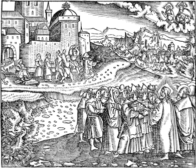 Description: Jesus speaks woes upon the Pharisees as a prophet is stoned in the background.