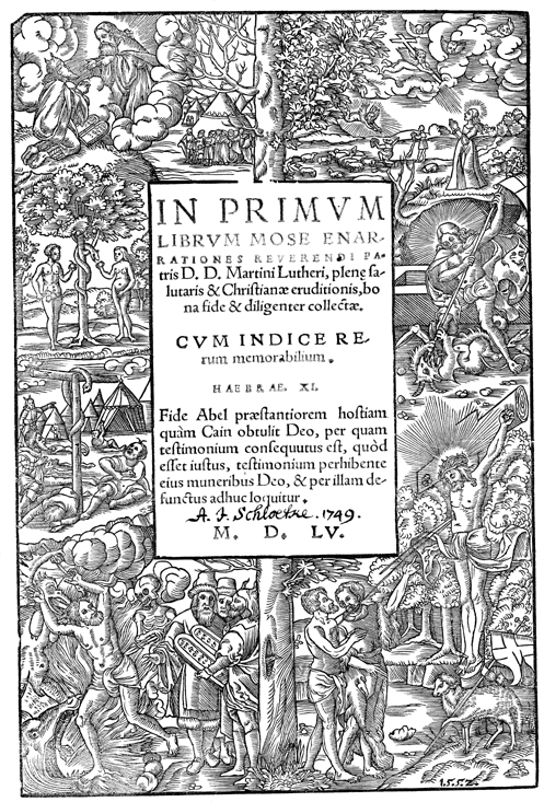Description: This historiated title-page border is based on the Gotha version of Lucas Cranach the Elder’s painting, “Law and Gospel” (or “Sin and Redemption”). The tree at the center is dead on the left but alive on the right, representing Law and Gospel, respectively, and on the side of each is a cluster of illustrative images. The woodcut is dated 1552 (lower right).