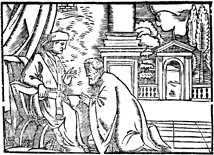 Description: A man kneels before a priest in penitence.