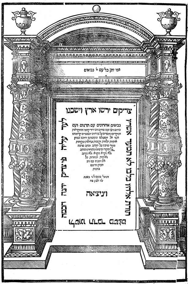 Description: An architectural title-page border with a column on either side of the Hebrew text.
