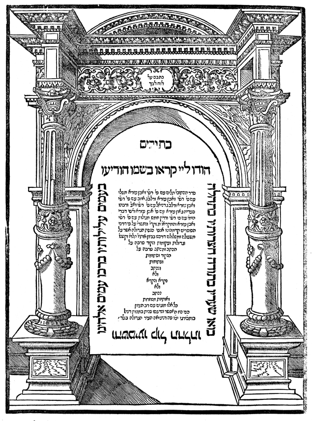 Description: An architectural title-page border with a column on either side of the Hebrew .