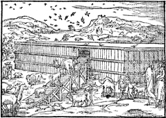 Description: Noah and his family make final preparations, as the animals enter the ark two by two. Illustration by Pierre Eskrich (ca. 1550-ca. 1590).
