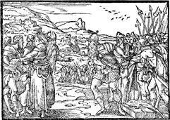 Description: Abram gives Melchizedek, king of Salem, a tenth of everything from the spoils of war, and Melchezedek gives Abram and his forces bread and wine. Illustration by Pierre Eskrich (ca. 1550-ca. 1590).