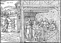 Description: A young Ishmael and Isaac wrestle on the floor during a feast held in Isaac’s honor, as Sarah tells Abraham that Hagar and Ishmael must leave (right). Early the next morning, Abraham sees Hagar and Ishmael off, as they make their way toward the desert of Paran. Illustration by Pierre Eskrich (ca. 1550-ca. 1590).
