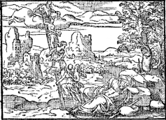 Description: God blesses Jacob while he dreams, as angels descend and ascend a ladder connecting heaven and earth. Illustration by Pierre Eskrich (ca. 1550-ca. 1590).