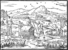 Description: Upon seeing Rachel for the first time, Jacob, with help from the shepherds from Haran, removes the stone from the well and waters her flock. Illustration by Pierre Eskrich (ca. 1550-ca. 1590).