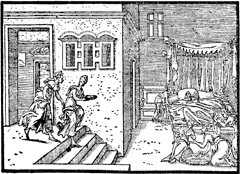 Description: Rachel’s maidservants tend to her after she gives birth to her first child, Joseph. Illustration by Pierre Eskrich (ca. 1550-ca. 1590).