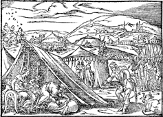 Description: Jacob is unaware that Rachel has stolen her father’s (Laban’s) household gods, as he searches through Jacob’s belongings. Meanwhile, Rachel conceals the idols by sitting on the bag where the idols have been hidden. Illustration by Pierre Eskrich (ca. 1550-ca. 1590).