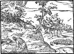 Description: God speaks to Moses from the burning bush, as Moses removes his sandals. Illustration by Pierre Eskrich (ca. 1550-ca. 1590).