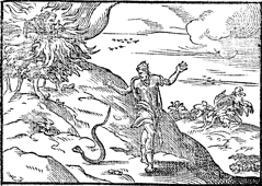 Description: God speaks from the burning bush and shows Moses a sign by turning his staff into a snake. Illustration by Pierre Eskrich (ca. 1550-ca. 1590).