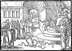 Description: Moses and Aaron appear before Pharaoh and turn Aaron’s staff into a serpent. This serpent then swallows the serpents created from the staffs of Pharaoh’s magicians. Illustration by Pierre Eskrich (ca. 1550-ca. 1590).