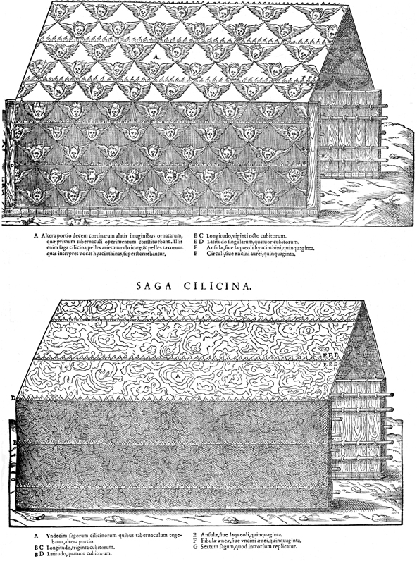Description: Curtains for the tabernacle, made with fine linen and blue, purple, and scarlet yarn. The top image is of the inner curtain and is embroidered in cherubim. The bottom image is of the outer curtain.