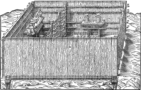 Description: The tabernacle frame and view of the interior of the tabernacle with ritual objects inside.