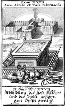 Description: A rendering of the altar of the burnt sacrifice and the courtyard around the tabernacle.