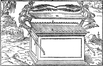 Description: The Ark of the Covenant with two poles made from acacia wood and two cherubim made of gold. Illustration by Pierre Eskrich (ca. 1550-ca. 1590).