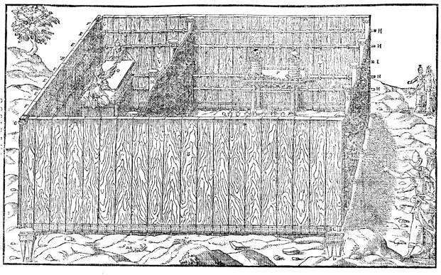 Description: A rendering of the frame and interior of the tabernacle showing ritual vessels. Illustration by Pierre Eskrich (ca. 1550-ca. 1590).
