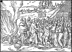 Description: Moses makes the Hebrews drink the melted down golden calf. Illustration by Pierre Eskrich (ca. 1550-ca. 1590).
