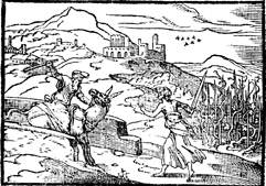 Description: Balaam beats his donkey for stopping as an angel stands in its way with sword raised. Illustration by Pierre Eskrich (ca. 1550-ca. 1590).