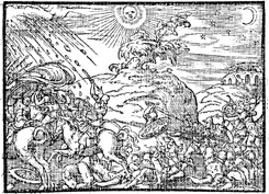 Description: Israel defeats the Amorites at Gibeon with the help of God, who rains down stones upon the Amorites and causes the sun and the moon to stand still. Illustration by Pierre Eskrich (ca. 1550-ca. 1590).