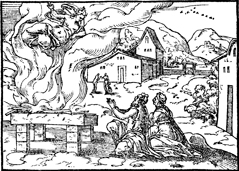 Description: An angel appears to Manoah and his wife from the fire of their sacrifice and proclaims the birth of Samson. Illustration by Pierre Eskrich (ca. 1550-ca. 1590).