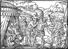 Description: Saul’s armor is placed on David before he goes to face Goliath, but the youth finds the armor heavy and cumbersome. Illustration by Pierre Eskrich (ca. 1550-ca. 1590).