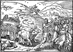 Description: As David brings the ark of God into Jerusalem on a cart driven by oxen, Uzzah touched the ark to steady it; as a result, the Lord struck down Uzzah, and David was angry and afraid to keep the ark. Illustration by Pierre Eskrich (ca. 1550-ca. 1590).