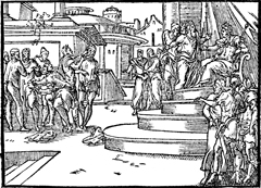 Description: When David shows sympathy for the death of Hanun’s father, Hanun seizes David’s men and shaves half of their beards and cut off their lower garments. Illustration by Pierre Eskrich (ca. 1550-ca. 1590).