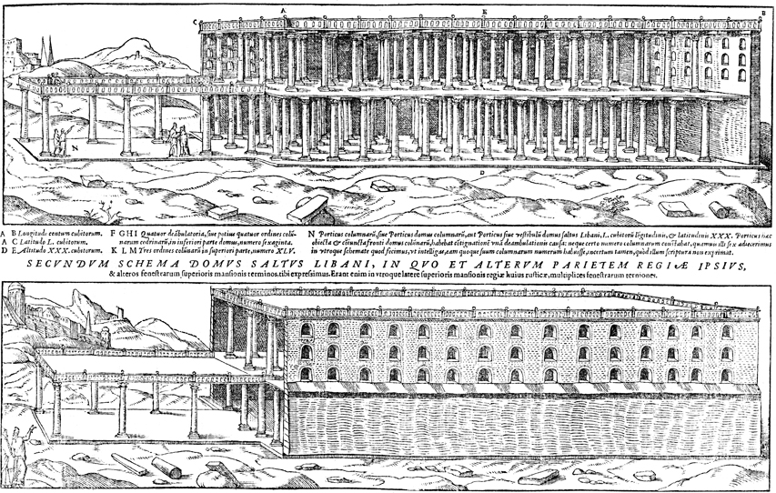 Description: Interior and exterior views of Solomon’s palace. Illustration by Pierre Eskrich (ca. 1550-ca. 1590).