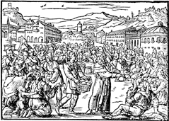 Description: Elisha feeds 100 with twenty loaves of bread. Illustration by Pierre Eskrich (ca. 1550-ca. 1590).