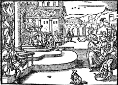 Description: The Queen of Sheba visits King Solomon in Jerusalem. Illustration by Pierre Eskrich (ca. 1550-ca. 1590).