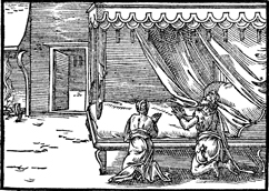 Description: Tobias and Sarah pray before consummating their marriage. Illustration by Pierre Eskrich (ca. 1550-ca. 1590).