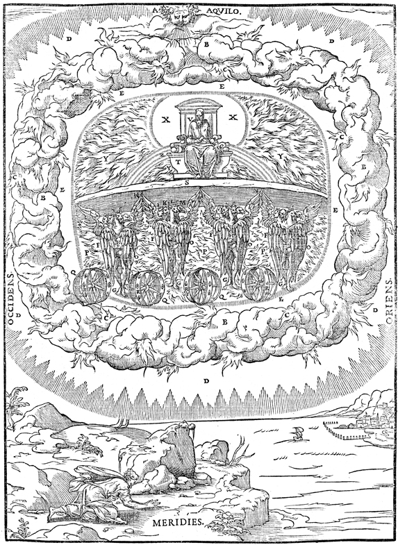Description: Ezekiel’s vision of the heavenly throne room includes God reigning above, the wheel within the wheel, and the four creatures (man, lion, ox, and eagle). Illustration by Pierre Eskrich (ca. 1550-ca. 1590).