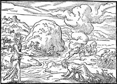 Description: Daniel receives a vision from a man with a face like lightning and eyes like flaming torches. Illustration by Pierre Eskrich (ca. 1550-ca. 1590).