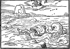 Description: God gives Jonah a second chance as the big fish spews him out upon dry land. Illustration by Pierre Eskrich (ca. 1550-ca. 1590).
