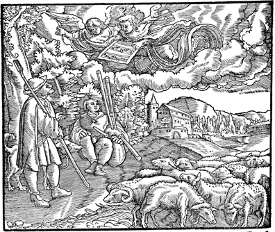 Description: Angels tell shepherds of the birth of Jesus.