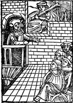 Description: As a congregation gathers for Christian worship on Sunday, a man works outside in violation of the third commandment: "Thou shalt remember the Sabbath." While in this instance the woodcut introduced a sermon on Ezekiel 37, it is of the sort used to illustrate the keeping of the Sabbath.