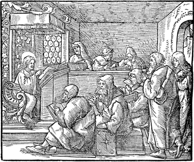 Description: Mary and Joseph find the twelve-year-old Jesus in the temple, sitting among the teachers, listening and asking questions.