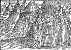 Description: Joshua and Caleb return from the exploration of Canaan and report to Moses of its abundance, indicated by the large size of the grape clusters they bear.