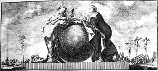 Description: The Apostle John extends a cup toward Moses who is holding the Ten Commandments. To the right is the scene of Calvary and to the left is the serpent that Moses lifted up in the wilderness to save the Israelites from snakebites.