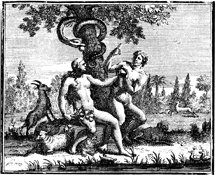 Description: The serpent watches closely, as Adam appears to remind Eve of God’s words concerning the forbidden fruit that she holds in her hand. Engraving by Martin Bernigeroth (1670-1733) after the design of Samuel Bottschild (1641-1707).