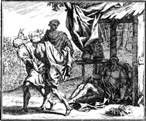 Description: Ham dishonors Noah by pointing out his nakedness, but Shem and Japheth cover their father with a sheet. Engraving by Martin Bernigeroth (1670-1733) after the design of Samuel Bottschild (1641-1707).