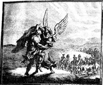Description: After sending his family ahead of him (background), an angel appears to Jacob and wrestles with him throughout the night. Engraving by Martin Bernigeroth (1670-1733) after the design of Samuel Bottschild (1641-1707).