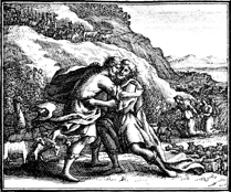 Description: Esau’s men and Jacob’s family witness the brothers’ reconciliation. Engraving by Martin Bernigeroth (1670-1733) after the design of Samuel Bottschild (1641-1707).