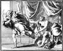 Description: As Potiphar’s wife attempts to seduce Joseph, he flees and leaves his tunic in her hand. Engraving by Martin Bernigeroth (1670-1733) after the design of Samuel Bottschild (1641-1707).