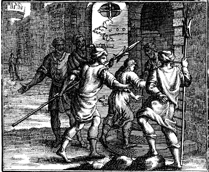 Description: Potiphar has Joseph arrested and imprisoned, after his wife shows him Joseph’s tunic and accuses him of attempting to sleep with her. Engraving by Martin Bernigeroth (1670-1733) after the design of Samuel Bottschild (1641-1707).