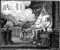 Description: While Pharaoh sleeps, he dreams of seven fat and seven lean cows, and seven good and seven lean stalks. Engraving by Martin Bernigeroth (1670-1733) after the design of Samuel Bottschild (1641-1707).