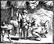 Description: Joseph promises his father that he will bury him in Canaan, not Egypt. Engraving by Martin Bernigeroth (1670-1733) after the design of Samuel Bottschild (1641-1707).