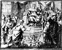 Description: Moses and Aaron appear before Pharaoh and turn Aaron’s staff into a serpent. This serpent then swallows the serpents created from the staffs of Pharaoh’s magicians. Engraving by Martin Bernigeroth (1670-1733) after the design of Samuel Bottschild (1641-1707).